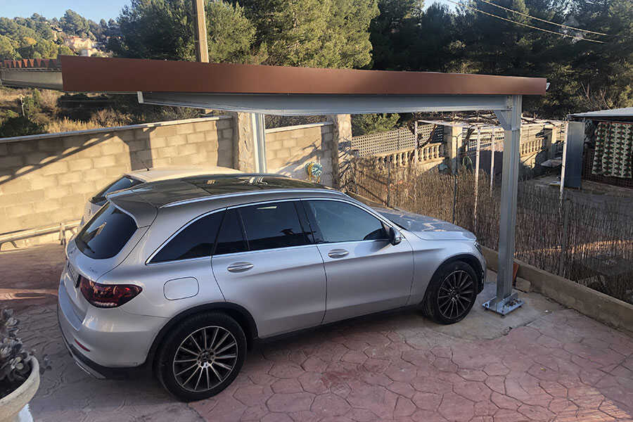 Instalación de marquesinas metálicas en vivienda particular de Piera (Barcelona) con capacidad para 2 coches. Cubierta con chapa tipo teja clásica color Rojo Teja.