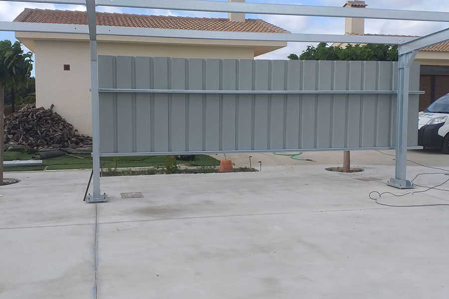 Instalación de marquesinas para 4 coches en chalet de Almansa (Albacete) con paramento vertical trasero para un huevo del parking con 2 correas y chapa lacada de 1,5 metros en blanco.
