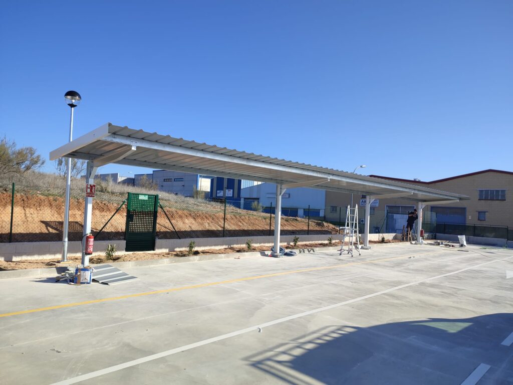 Cuatro ménsulas simples separadas a 6,5 metros con cubierta de chapa personalizada en color blanco pirineo de 21×3 metros. El pilar está a una altura especial de 2,5 metros con un brazo delantero de 2 metros con 2 filas de correas y chapa de 3 metros. Montado con anclajes químicos y resina epoxi en solera con hormigón armado existente.