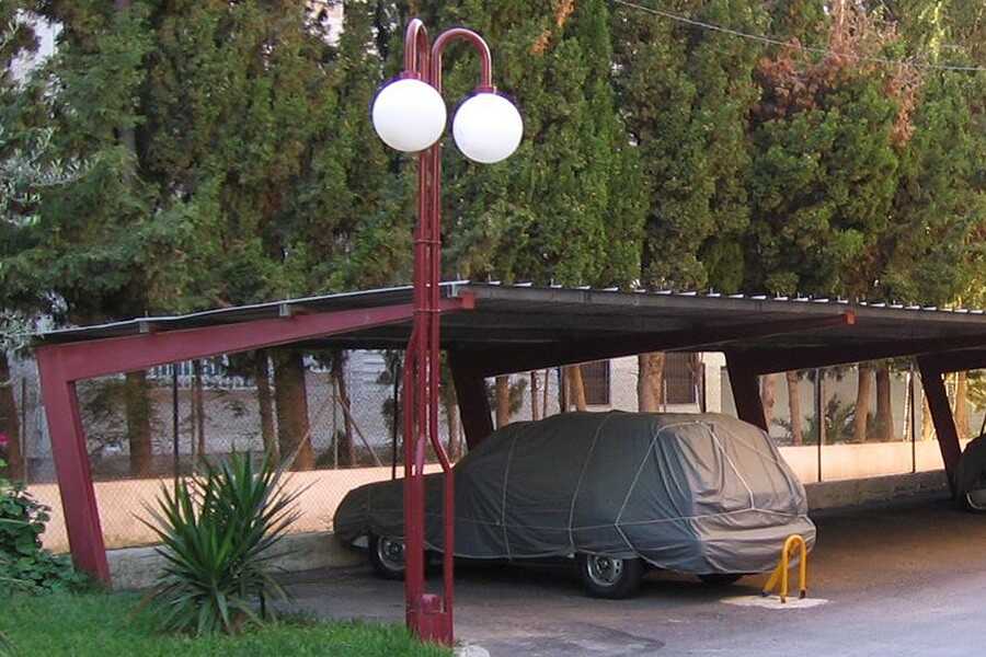 Catálogo de marquesina con ménsula recta tipo viga-cajón para instalar en aparcamiento exterior.