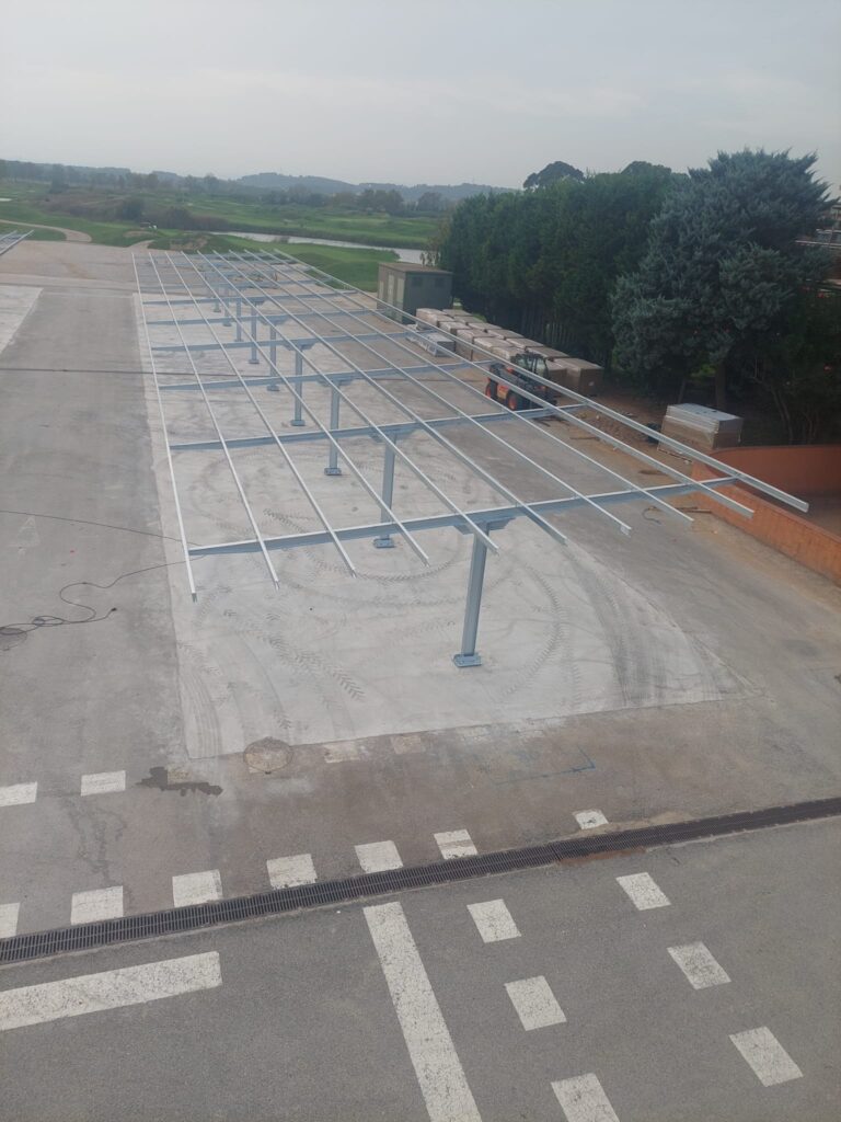 Marquesina para parking solar de 72 coches con 2 tramos de 10 ménsulas dobles especiales para el Empordà Golf Club de Gualta (Girona). La cubierta es de 48×10 metros con 10 filas de correas preparadas para colocar placas solares fotovoltaicas.