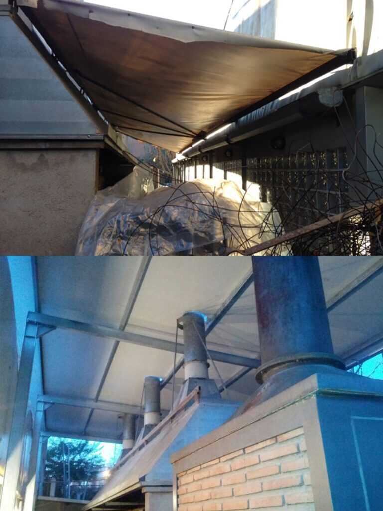 En las fotos se muestra el antes y el después del proyecto de instalación. La anterior lona de tela fue reemplazada por una resistente cubierta especial, mejorando la estética del local.