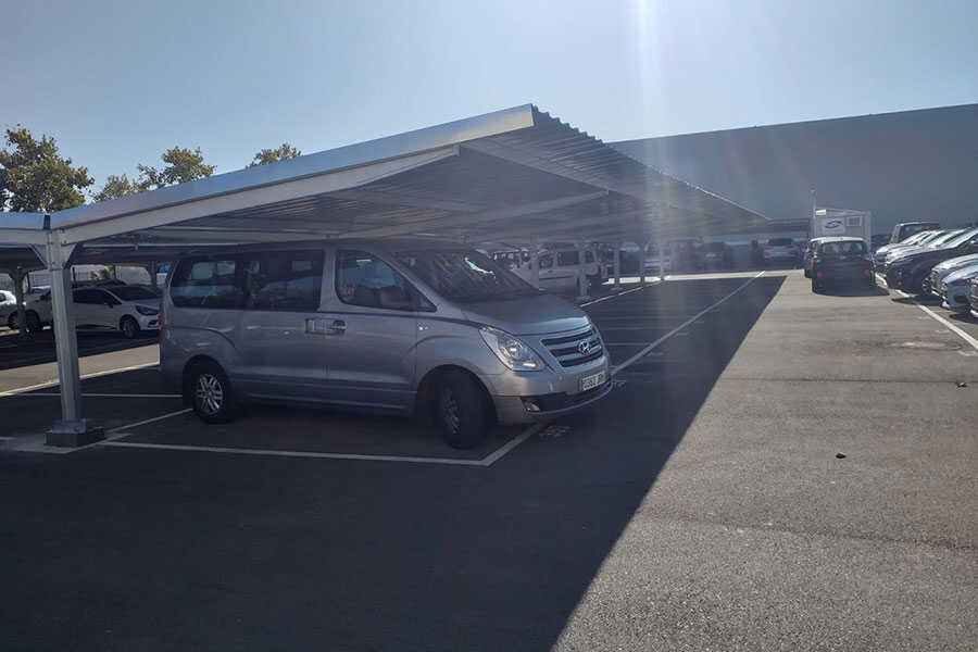 Fabricación de marquesinas metálicas para parking con capacidad de 56 en el concesionario de la marca Hyundai situado en Palma de Mallorca.
